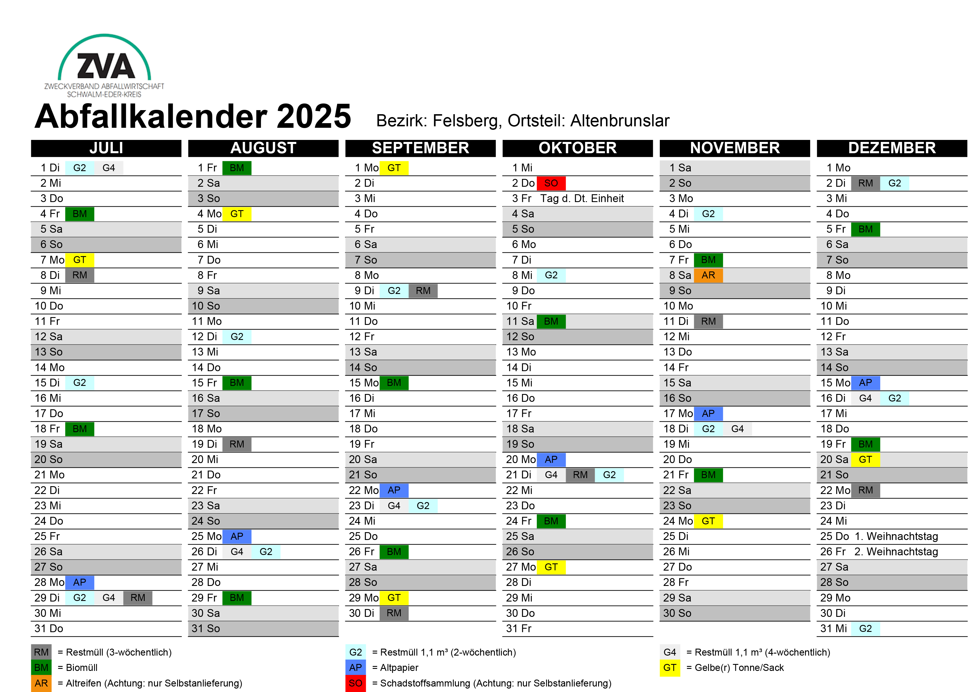 Hier der Abfallkalender für das ganze Jahr 2025 für Altenbrunslar zum Ausdrucken im PDF-Format: