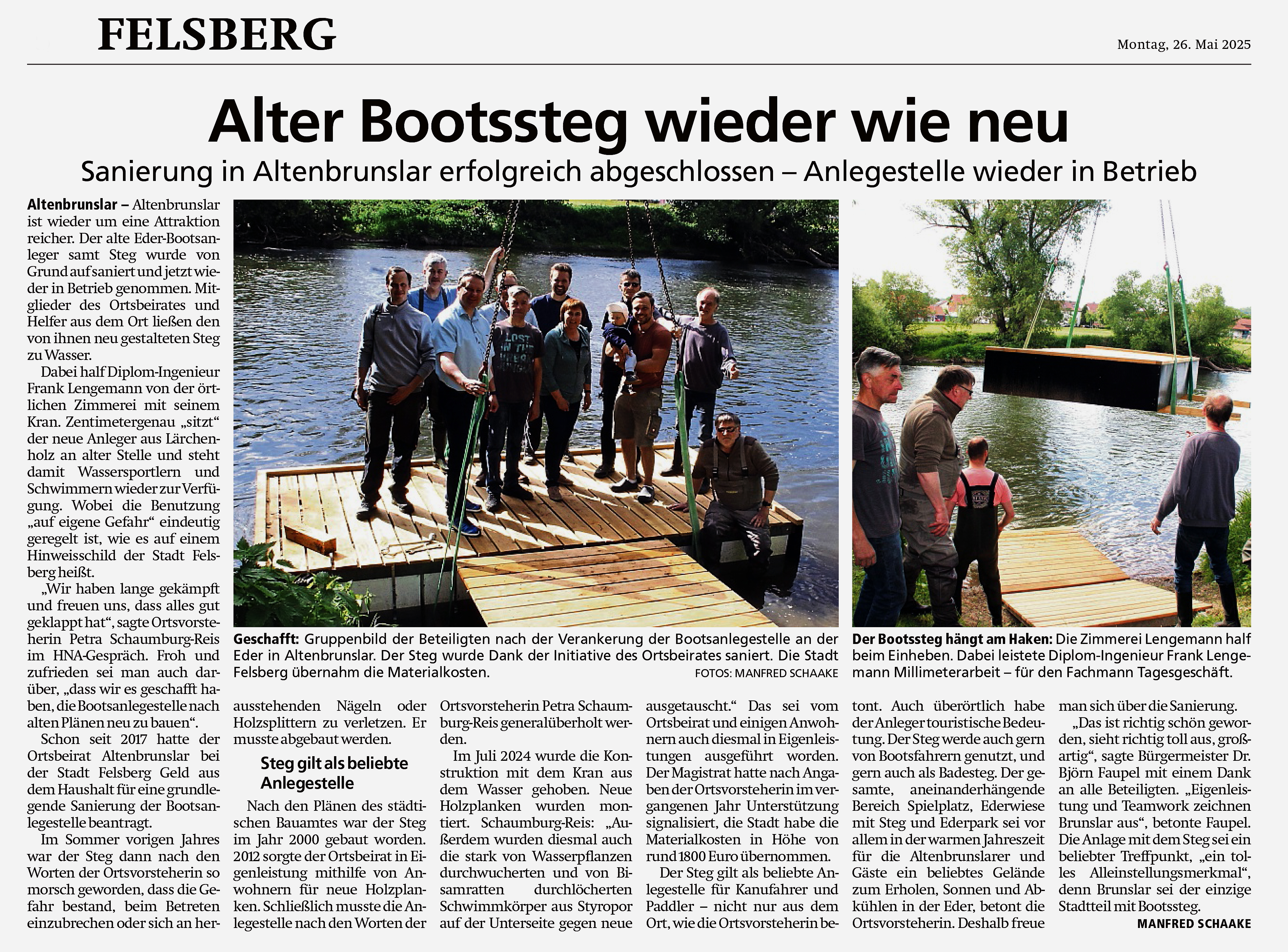 Am 24. Juli war es soweit: Frank Lengemann rückte mit seinem Kranwagen an und hob den sanierungsbedürftigen Bootssteg aus der Eder. Er liegt jetzt, mit Bauzäunen abgesperrt, auf der Ederwiese. Nach Absprache mit dem Bauhof der Stadt Felsberg werden der Ortsbeirat und weitere Helfer dort mit der Sanierung loslegen. Alle, die dort baden, sich sonnen, ihre Freizeit genießen, unbedingt beachten: Nicht die Zäune verrücken oder abbauen - sie dienen dazu, die Sanierungs-Baustelle zu schützen, damit niemand - schon gar keine spielenden Kinder - zu Schaden kommt.