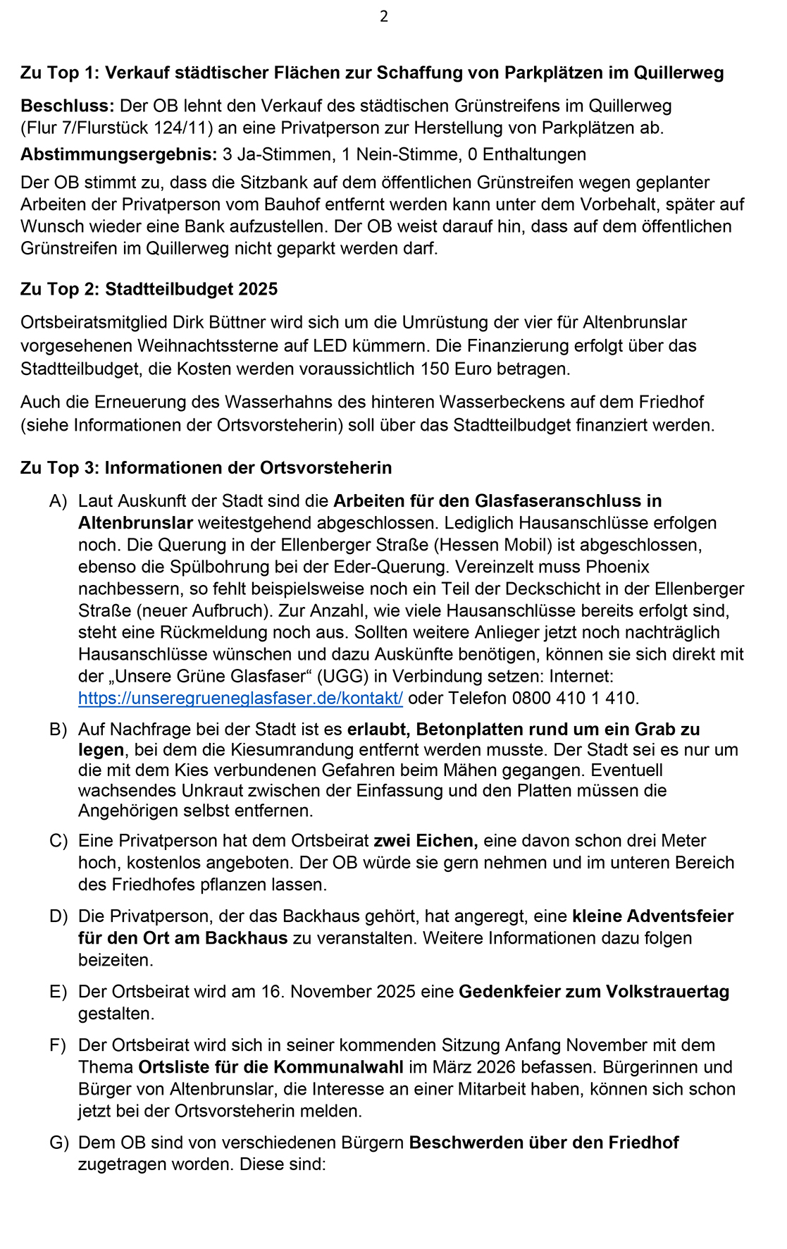 Im Gedenken an die Opfer von Krieg und Verfolgung legte der Ortsbeirat den Kranz an der Tafel mit den Namen der 47 gefallenen Soldaten aus Altenbrunslar nieder. Ein gemeinsames Friedensgebet beendete die Gedenkstunde – während der es leider zu regnen begonnen hatte, sodass ohne Regenschirme nichts mehr ging.